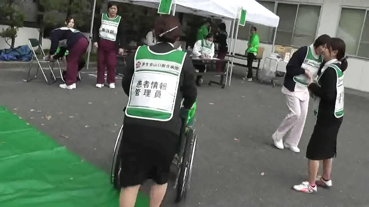今回は、職員が演じる模擬患者に対し、効率的に被災者を治療するために、赤・黄・緑エリアの3段階に区分するトリアージ作業から、各トリアージエリアで、医師・看護師・コメディカル・事務により、模擬治療・入院・黒エリアでの死亡確認(家族ケア)までを訓練しました。